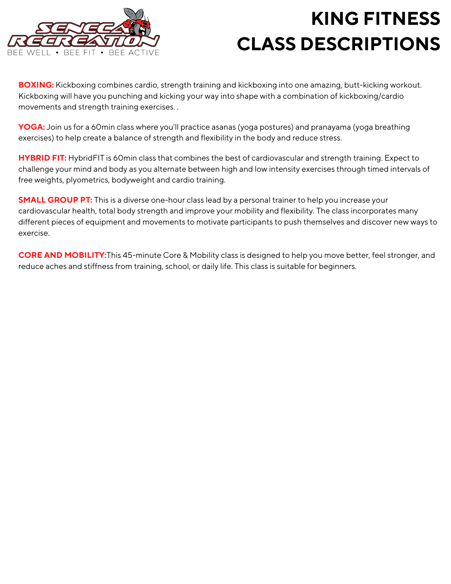 King Fitness Classes winter 2026 | Athletics & Recreation | Seneca Students