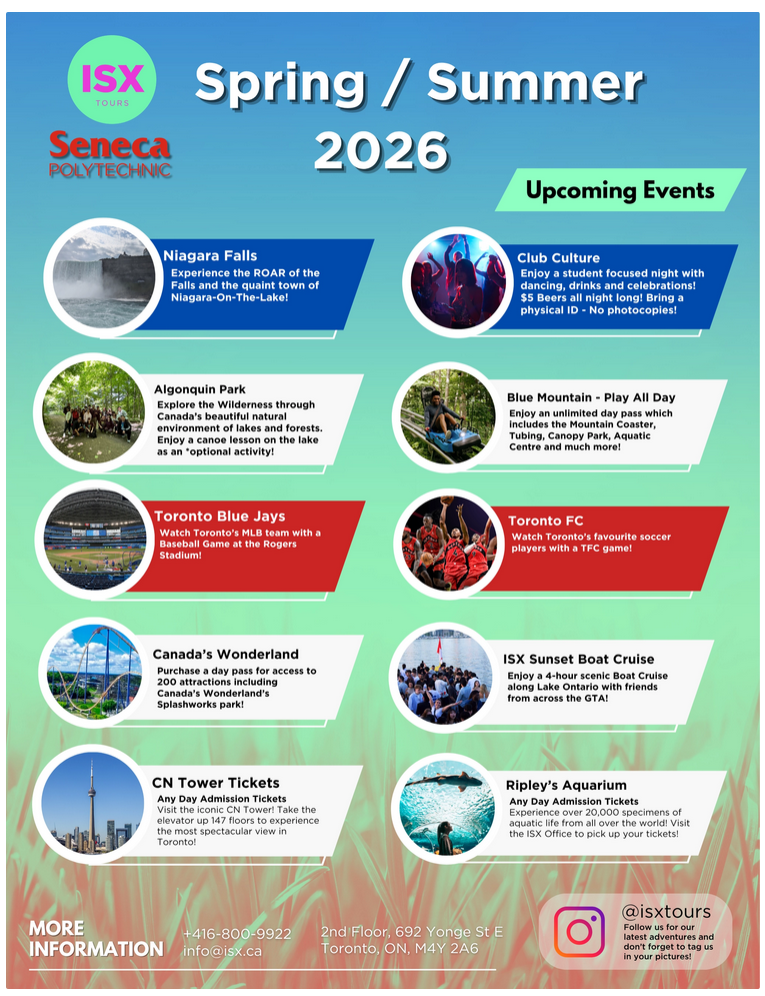 ISX is Seneca's trusted partner for student adventures. Trips and activities are run and hosted by ISX and their expert staff, giving you the chance to meet students from Seneca and other colleges. Check out ISX Tours for upcoming events.
